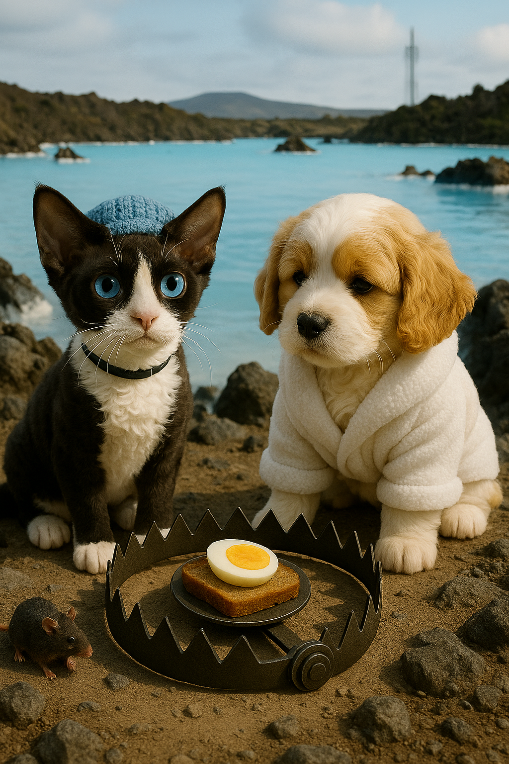 🐶 阿寶與Deven穿著冰藍浴巾/毛帽造型,泡於藍湖之中